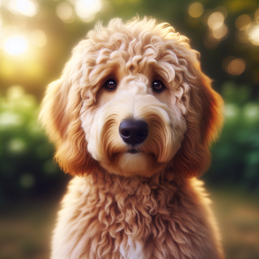 Adorable Goldendoodle Honey with fluffy apricot curls and warm, gentle eyes