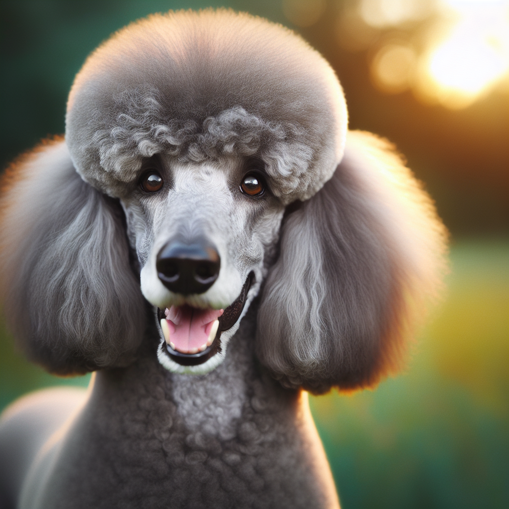 Elegant silver Standard Poodle Jasper with perfectly groomed curly coat and dignified bearing