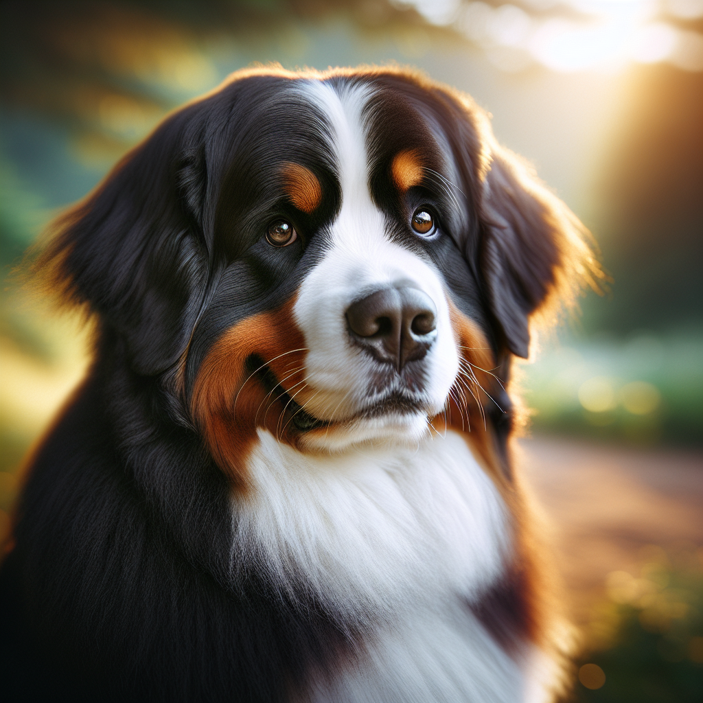 Gentle Bernese Mountain Dog Koda with his striking tri-colored coat and soulful, kind eyes